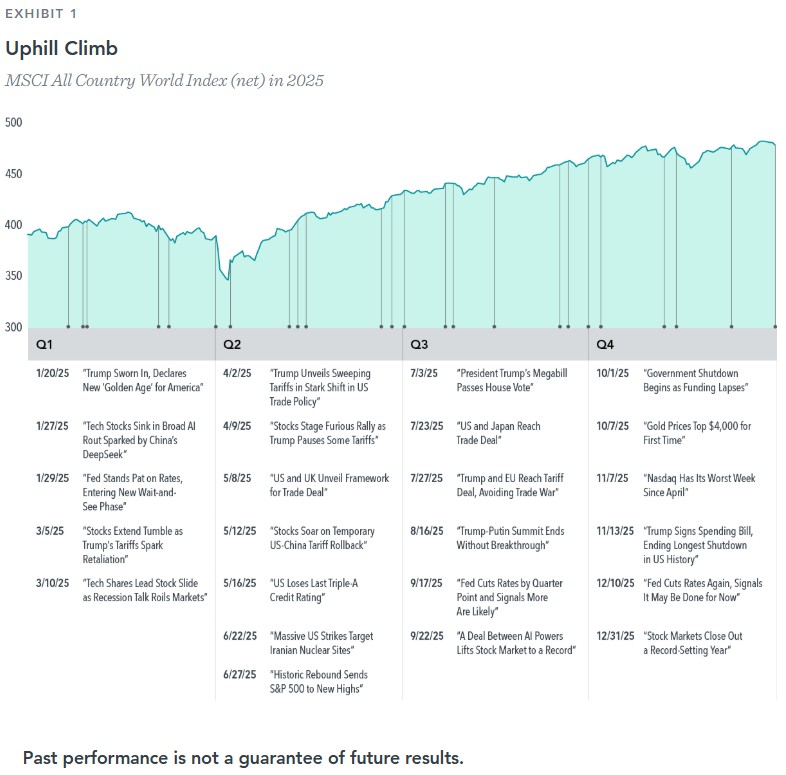 US stocks notched their third year in a row of double-digit gains, but it wasn’t the smoothest ride. The S&P 500 hit records in the winter that were followed by a spring swoon. After powering past that to new highs in the fall, the markets cooled a bit along with the temperatures.(1) Still, the S&P 500 was up 17.9% for the year and closed near record levels.(2) The climb came despite tariff uncertainty, interest rate changes, and concerns about the durability of AI’s gains—not to mention the longest government shutdown in US history.(3) Global stocks rose (see Exhibit 1), with returns in developed international and emerging markets better than those in the US. In the bond market, US Treasuries were higher for the year, and the benchmark 10-year yield fell to just above 4%.(4)