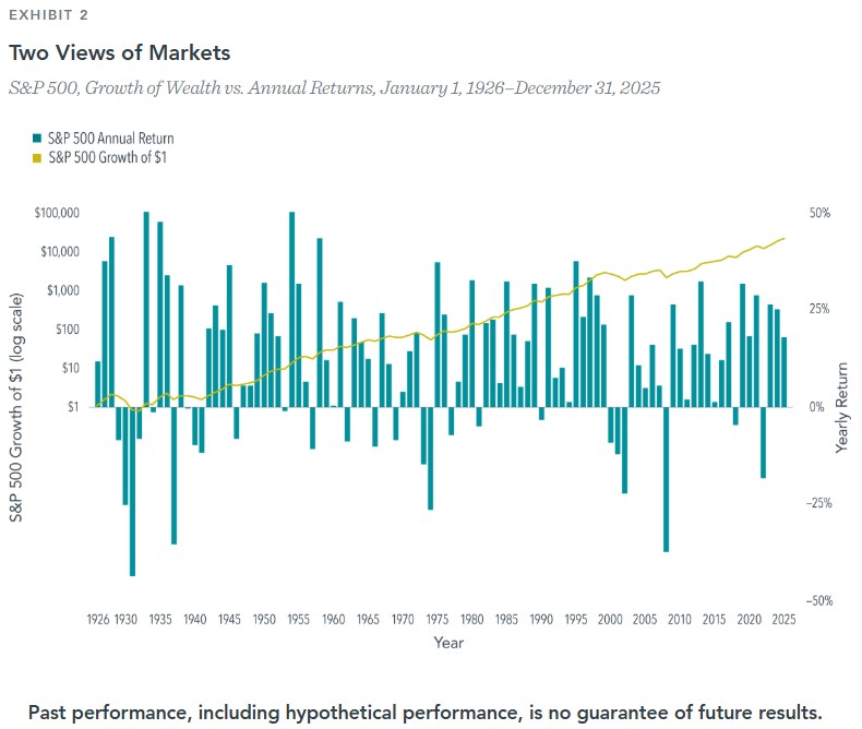 The same thinking can guide investors’ approach over longer time periods—especially when looking at data across many years or even decades. With reliable stock data stretching back to 1926, we are, as of this year, now able to consider a full century of stock returns. Doing so gives further credence to the merits of focusing on the long run. A short-term view of yearly gains and losses shows what may appear as wild swings in the market, as seen in Exhibit 2, but a long-term view reveals a fairly steady growth of wealth over the 100-year period.